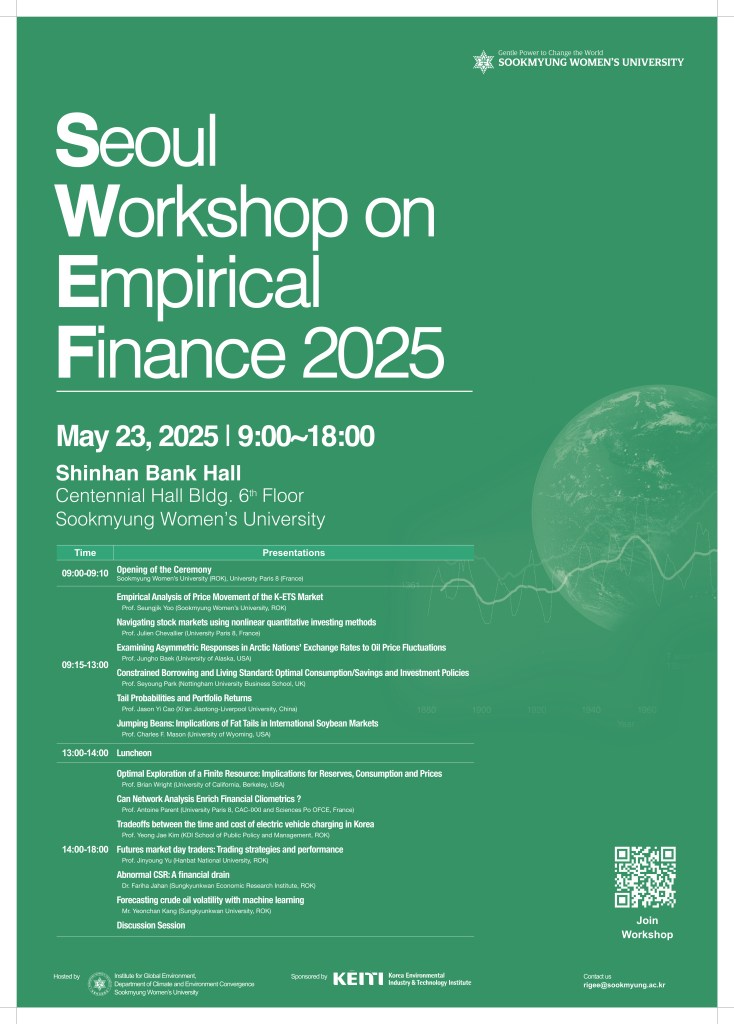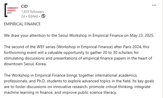 Mark your calendars for the Seoul Workshop in Empirical Finance on May 23, 2025.